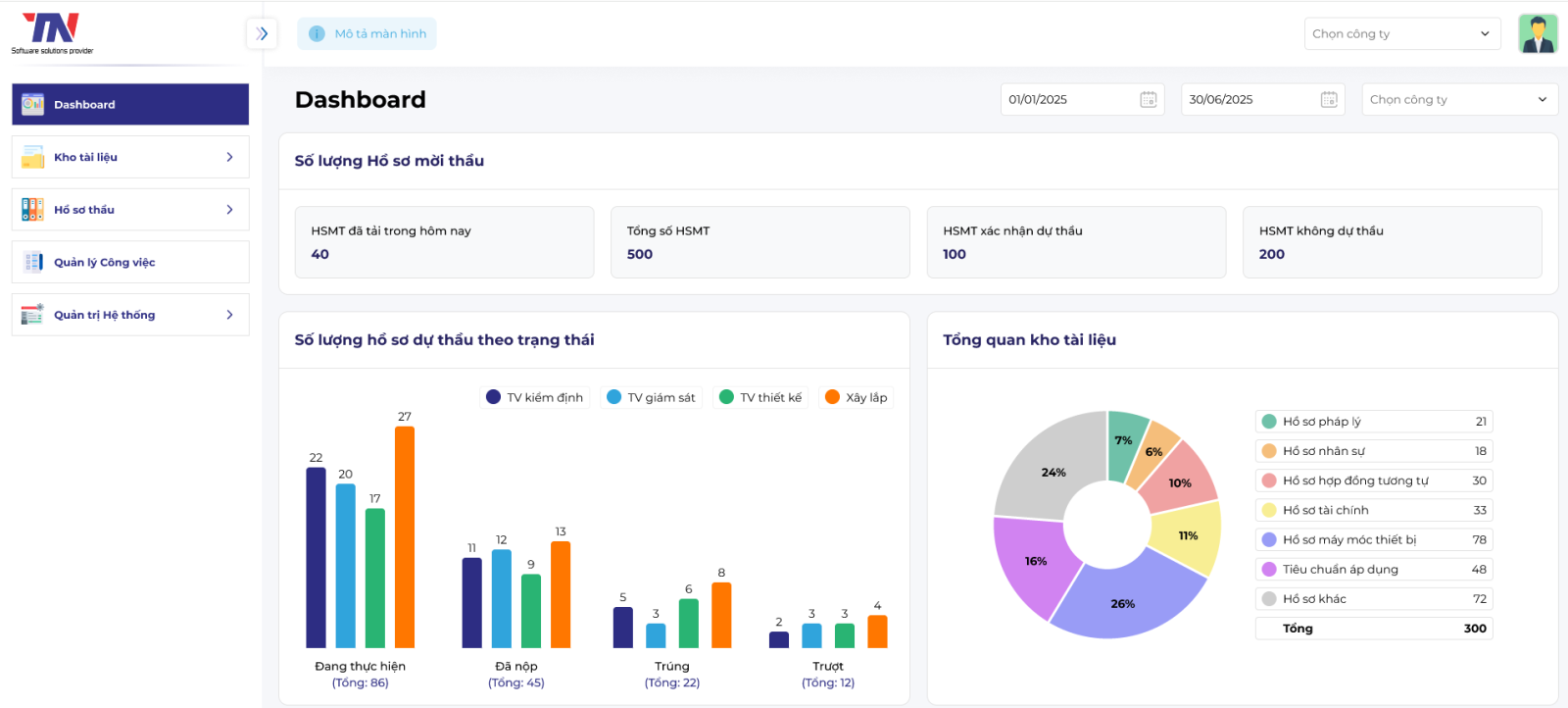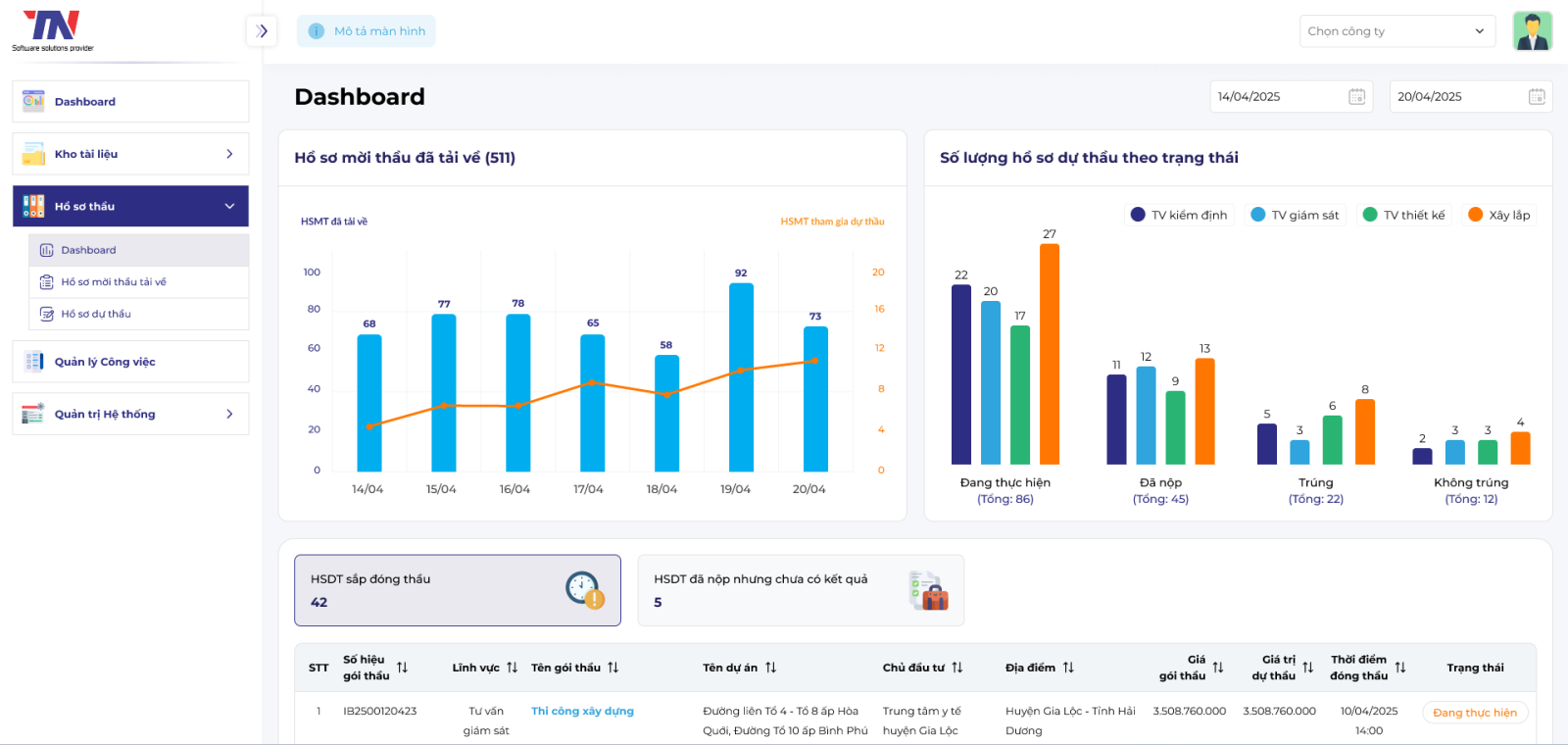 Lập danh mục các hồ sơ thầu đang và sẽ tham gia, theo dõi toàn bộ pipeline đấu thầu của doanh nghiệp;
